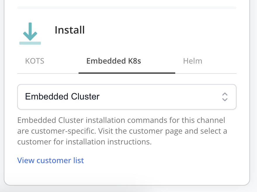 Installation instructions for the Helm CLI and Replicated Embedded Cluster are customer-specific. You can find installation instructions on the page for the target customer.